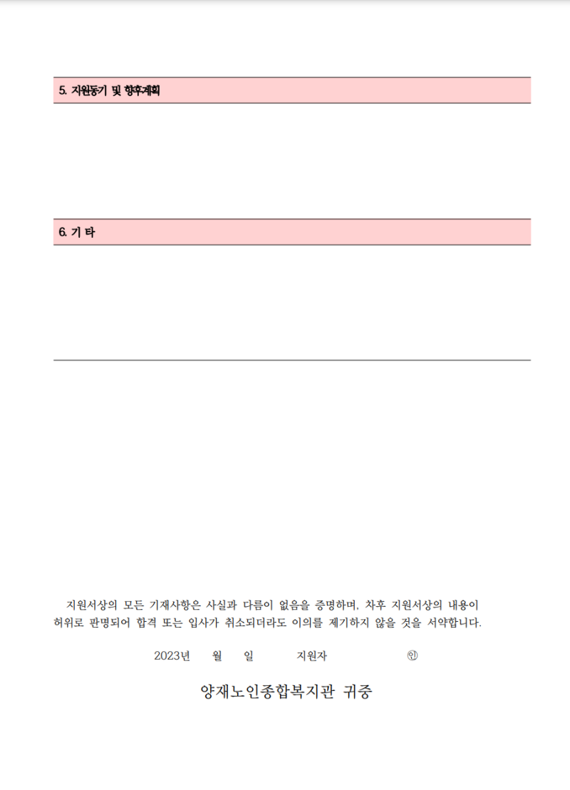 - [1] 지원동기 및 직무 역량: 본 복지관에 지원하게 된 동기와 직무 관련 경험 및 역량에 대해 구체적으로 기술하시오. (1000자 이내)