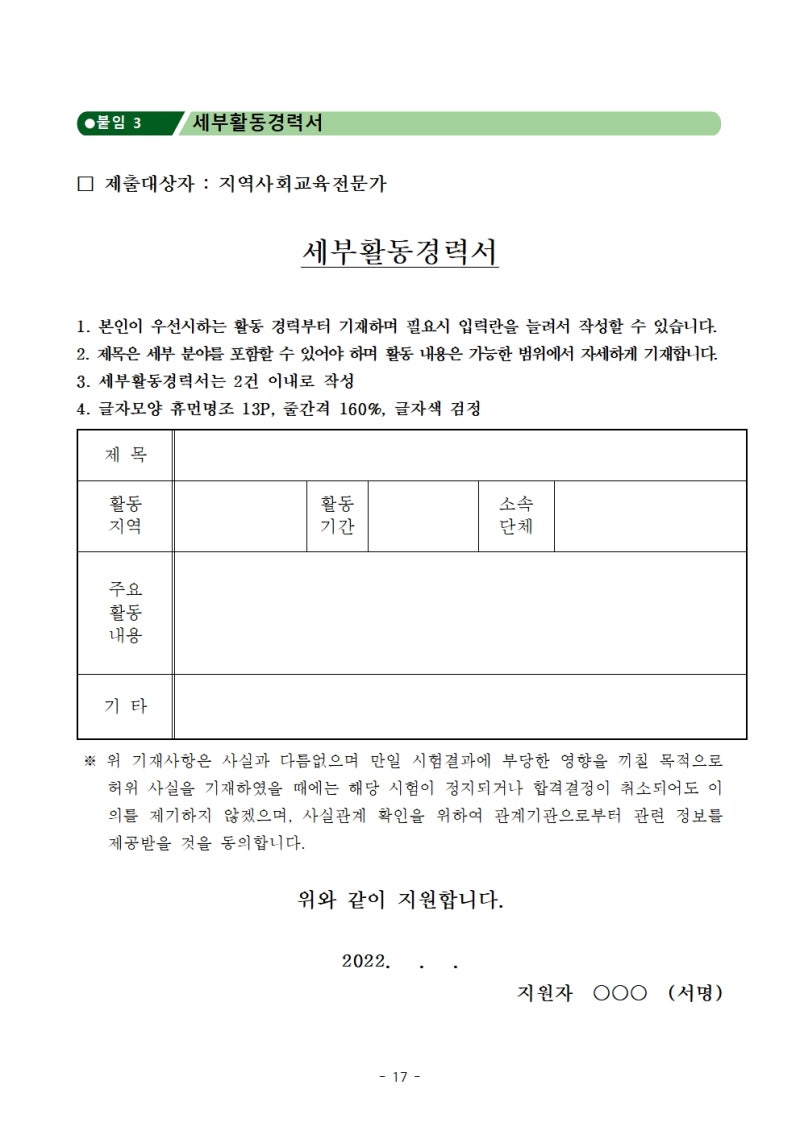 – 유치원 교육실무사 직무와 관련된 경험을 선별하여 제시해야 합니다.