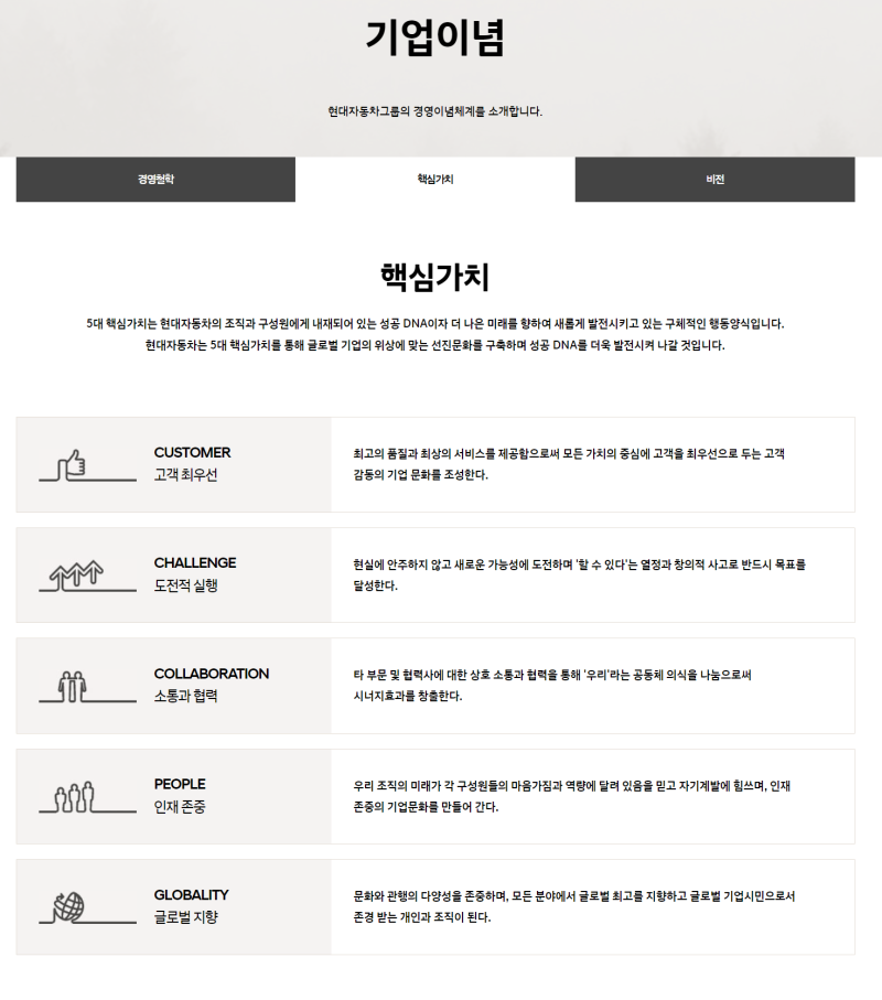 고객 최우선, 도전적 실행, 소통과 협력, 인재 존중, 글로벌 지향