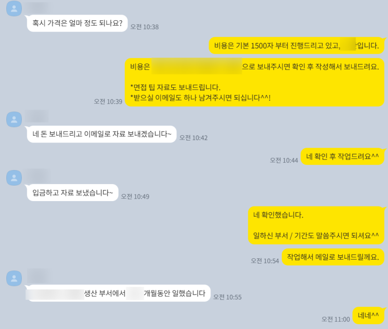 제가 직접 첨삭/대필하면서 얻은 노하우를 아낌없이 풀어드리겠습니다! 이번 PI첨단소재 생산직 자소서 컨설팅도 정말 심혈을 기울여 진행했습니다. 거의 대필 수준으로 갈아엎었어요! 고객님이 전에 쓰셨던 자소서를 들고 오셨는데, 글자 수도 안 맞고 문장도 어색해서 첨삭하면서 거의 다시 짰다고 봐야 해요 제발 다음엔 하루 전에는 와주셔요..! 진짜 그래야 저도 여유 있게 도와드릴 수 있거든요